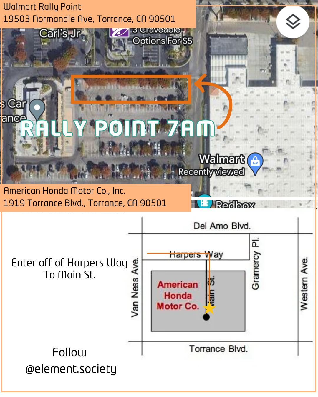 The Element Society will be meeting up for the 7:00am Rally Point at the nearby Walmart. Roll out to the meet will be at 7:30am so the Element Society can roll in as group to be parked together!